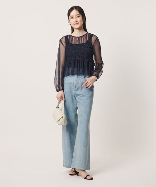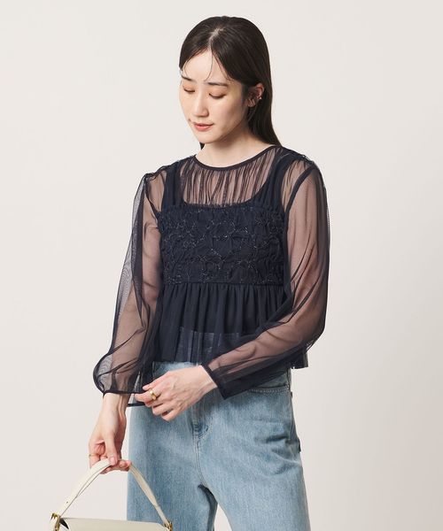トップスは、ユナイテッドアローズオリジナル刺繍を施したチュール素材。ラメ糸によるさりげない華やかさが魅力。