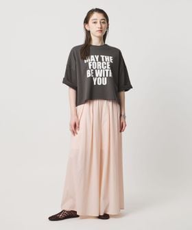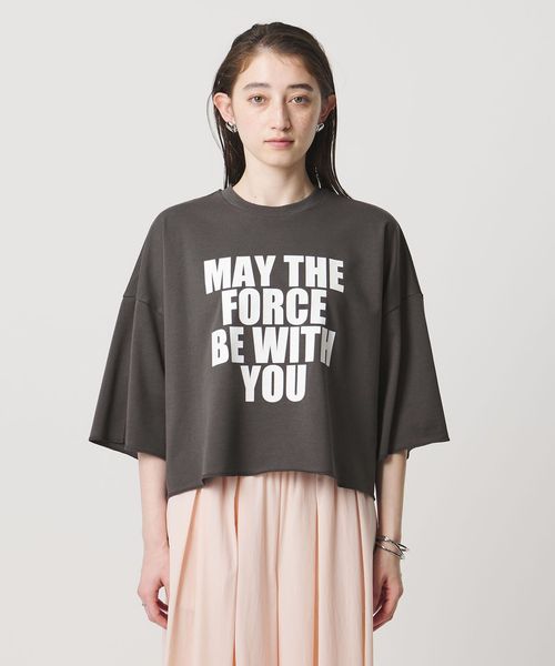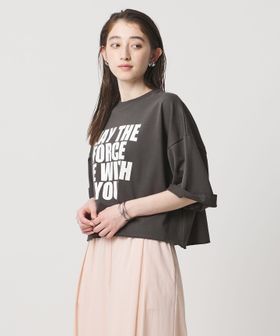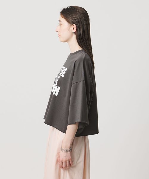 存在感のあるメッセージプリントが目を引く7分袖のTシャツ。