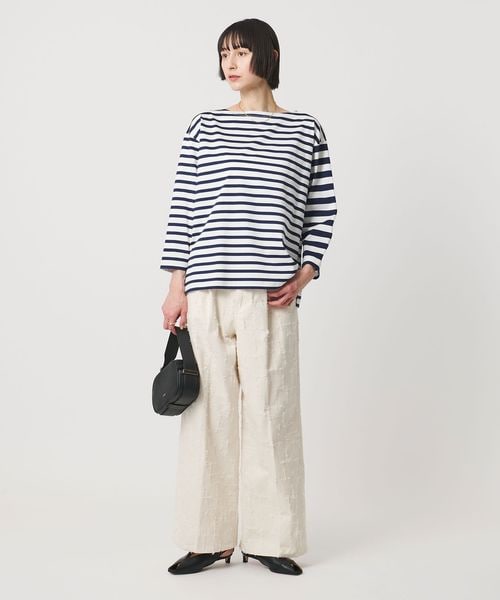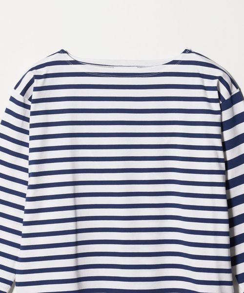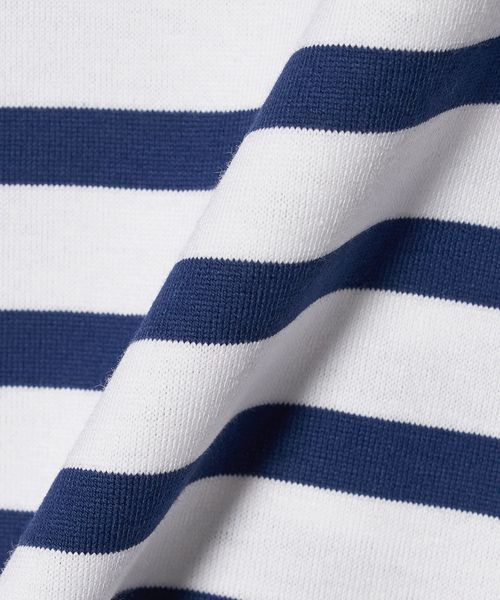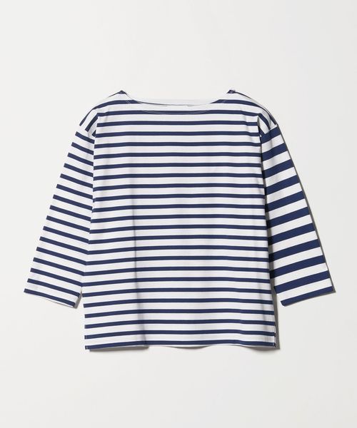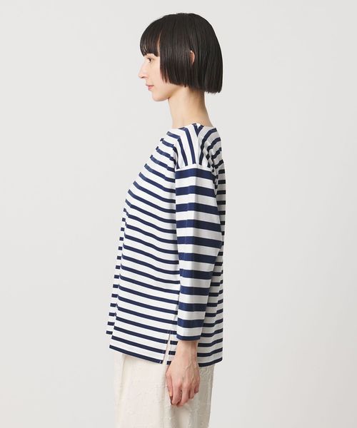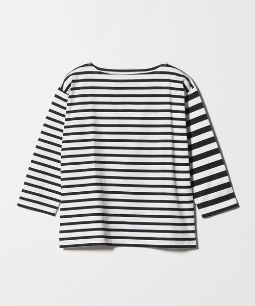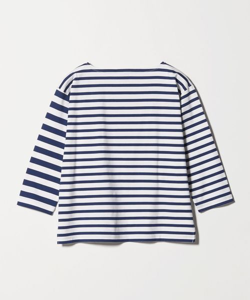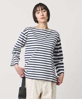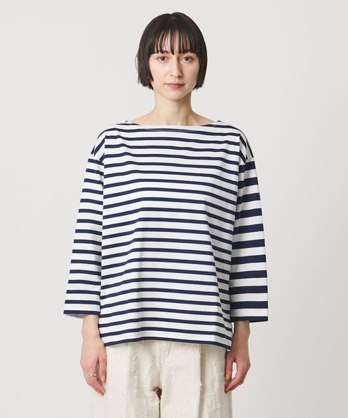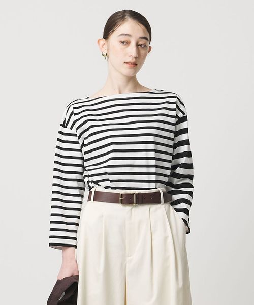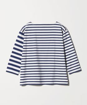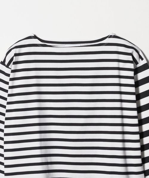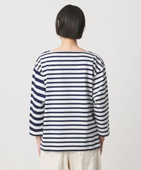 異なるボーダーを組み合わせたデザインが目を惹く、ボートネックのボーダーTシャツ。