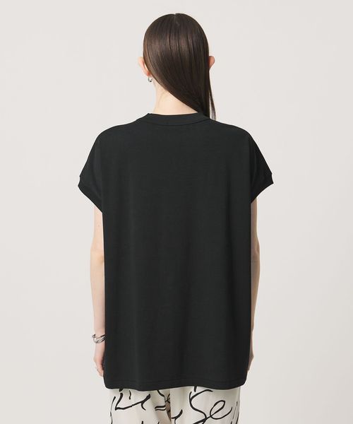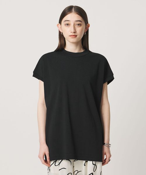 肩から二の腕にかけてをやさしく包み込むキャップスリーブの袖丈が、体のラインを拾いすぎず、自然とこなれた印象に導きます。