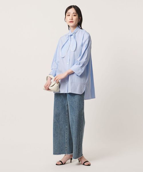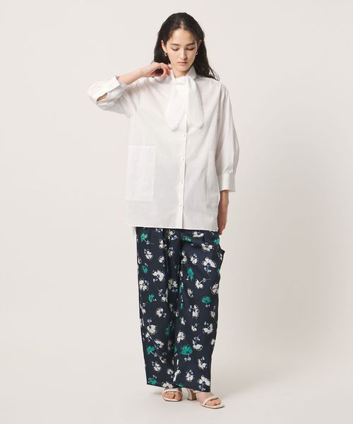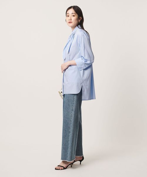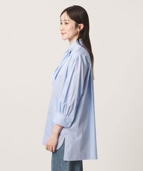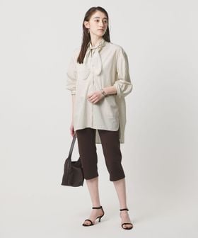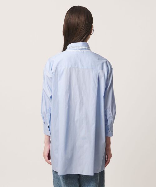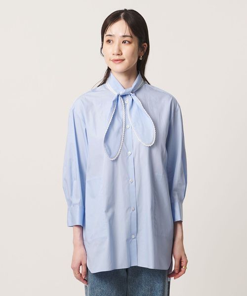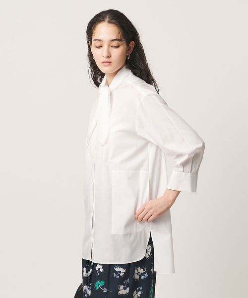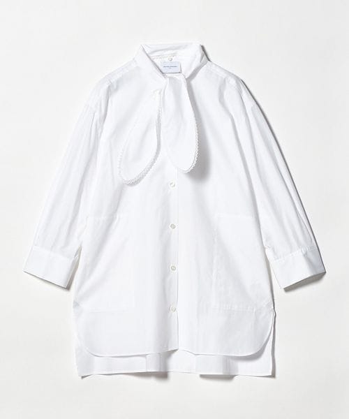 小ぶりなレースでトリミングしたタイがアクセントのチュニック丈シャツ。
