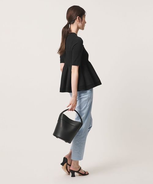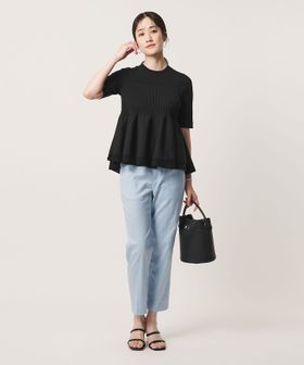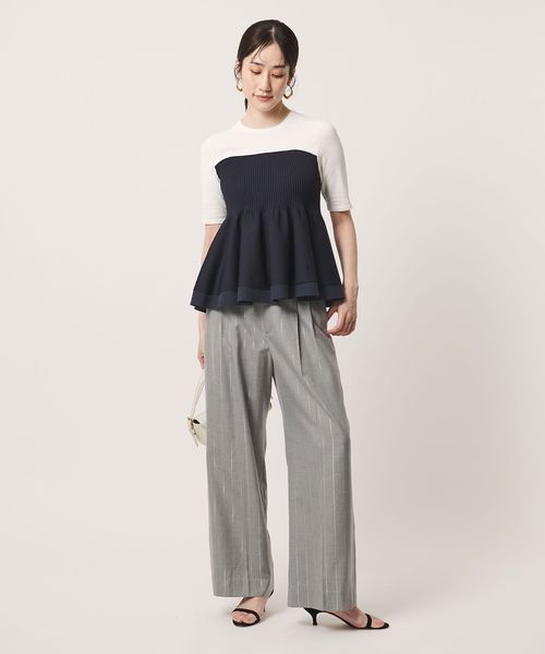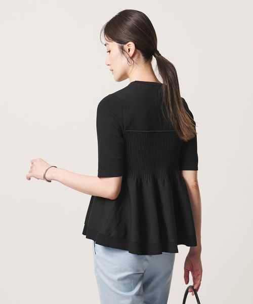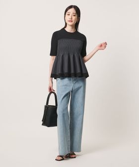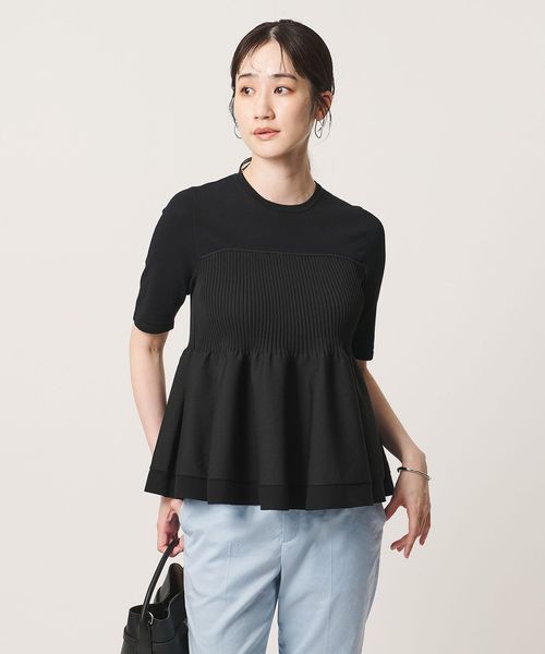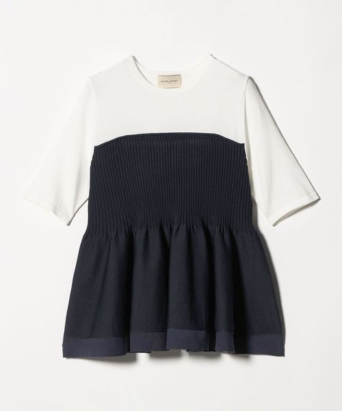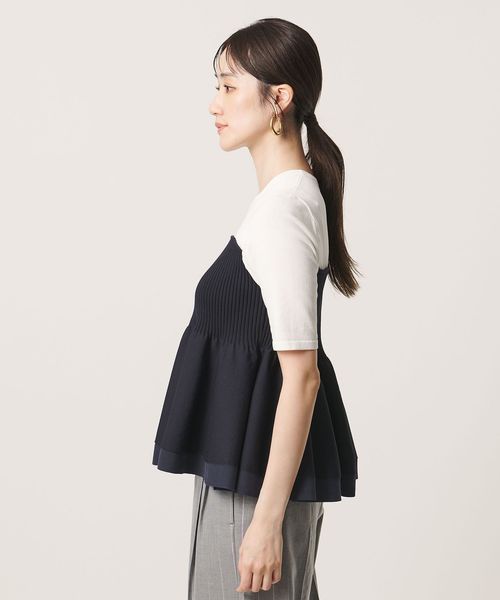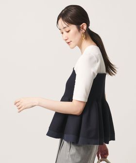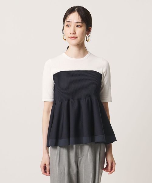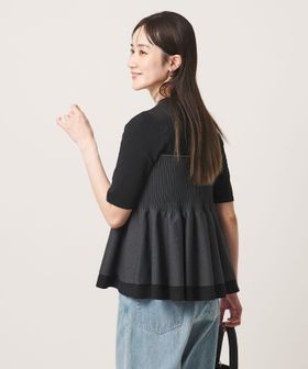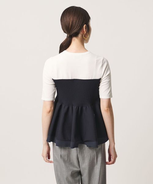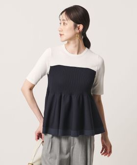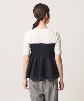 ハイゲージの半袖ニットに、ペプラムシルエットのビスチェをレイヤードしたようなデザインのトップス。