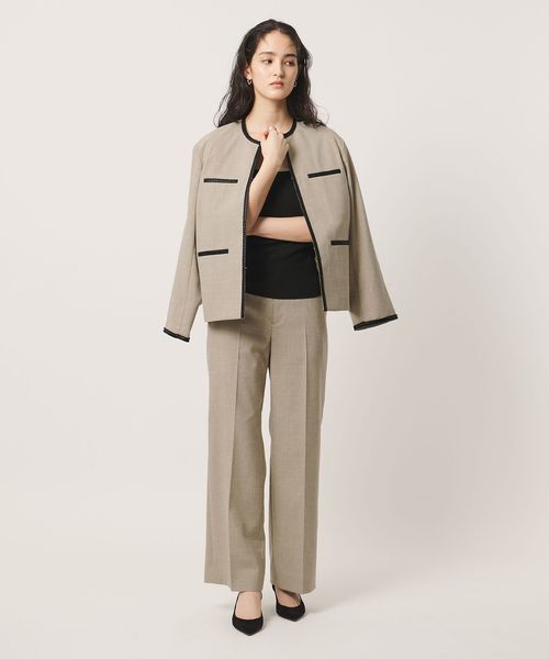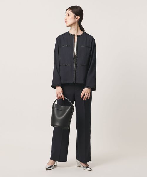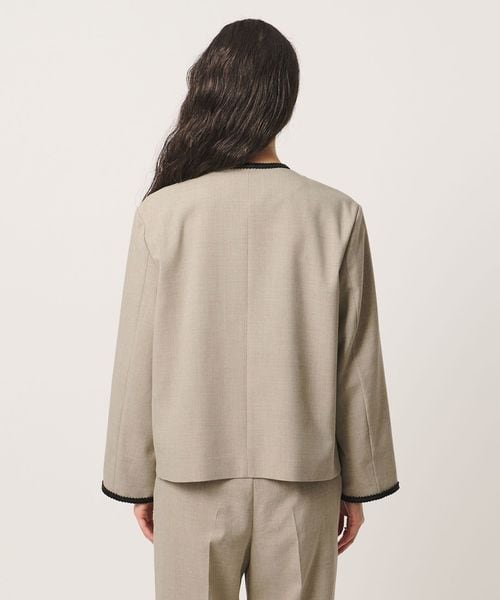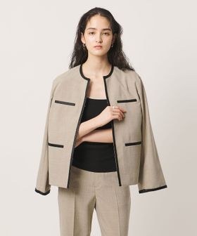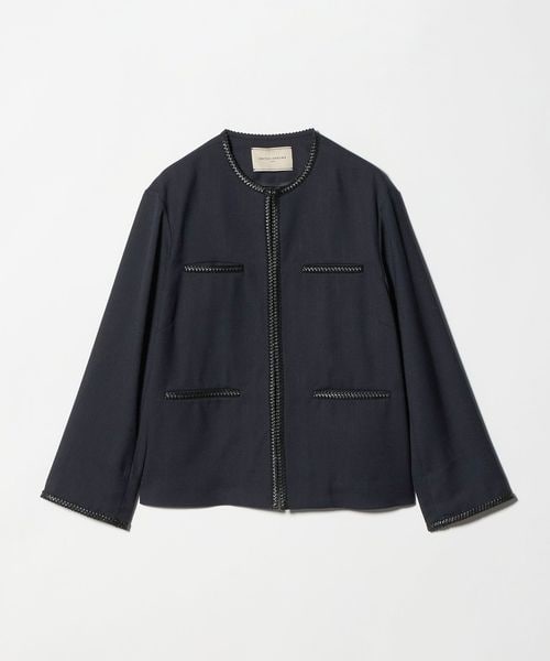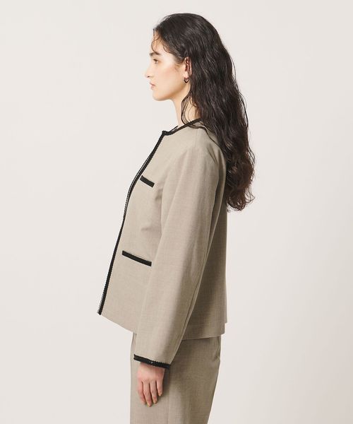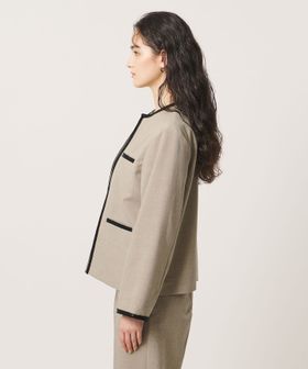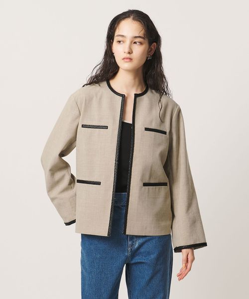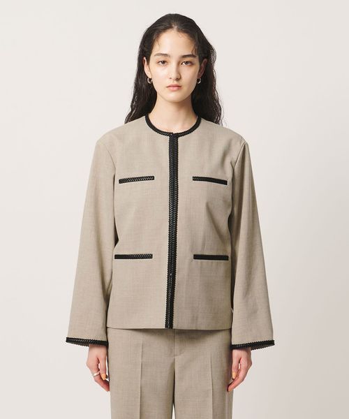 ポケットや襟まわり、袖口に施したレザー調ブレードがアクセントのノーカラージャケット。
