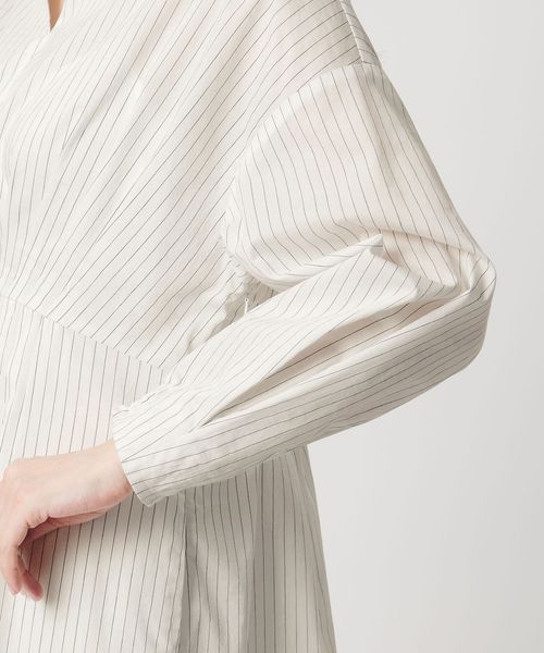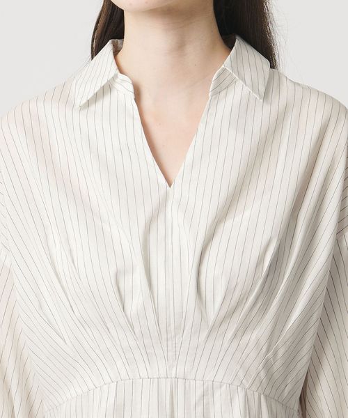 後ろウエストにはシャーリングを施して着心地の良さも叶え、Vネックと襟のバランスがきれいめな印象を与えてくれます。