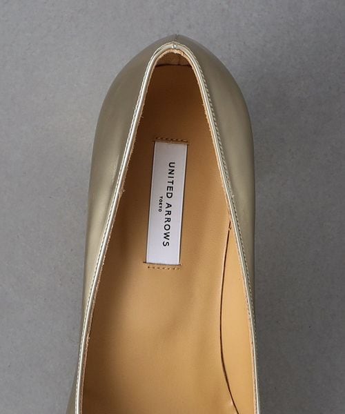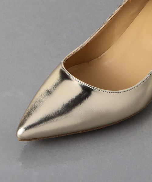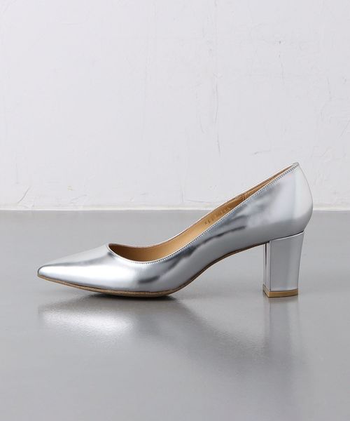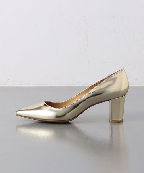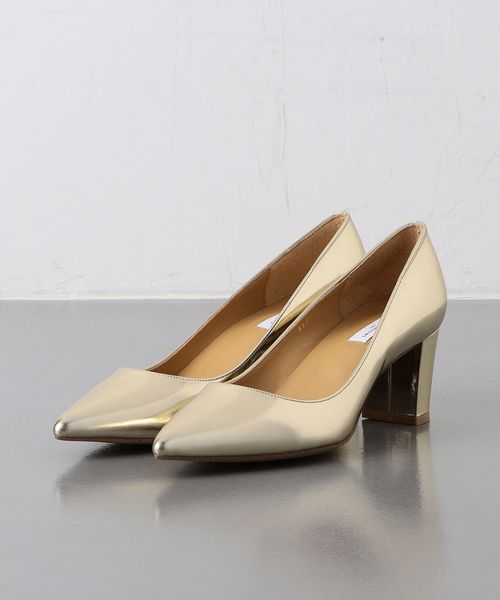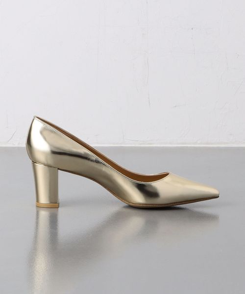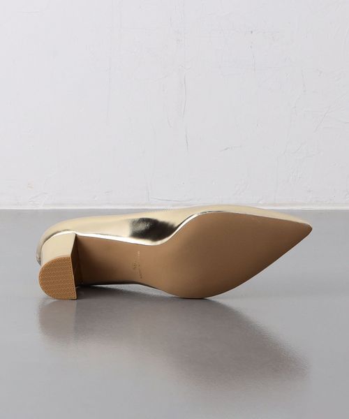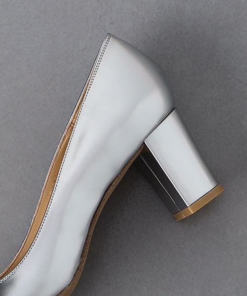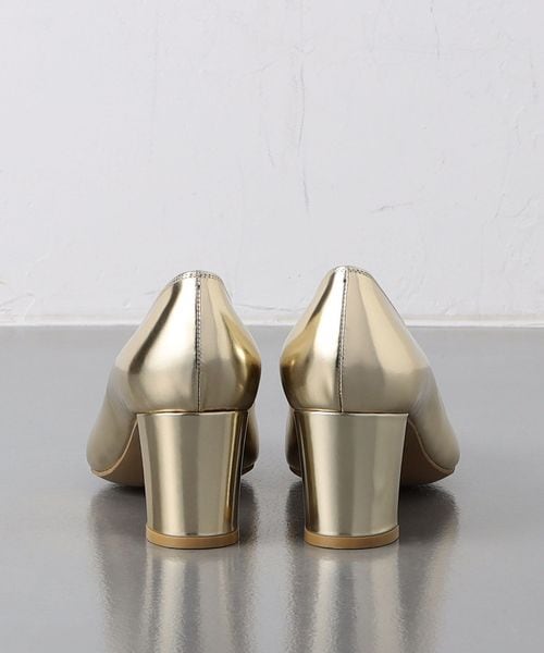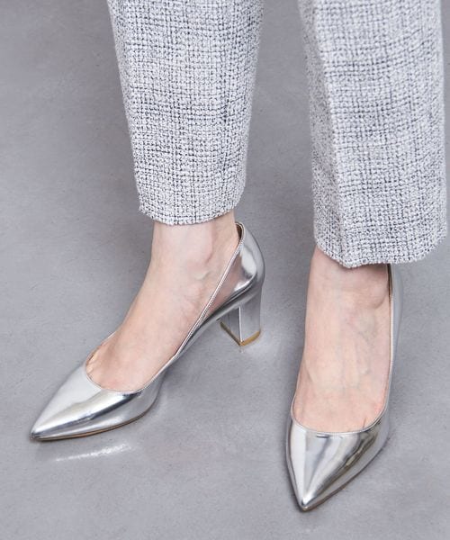メタリックカラーがコーディネートを華やかに仕上げるチャンキーヒールパンプス