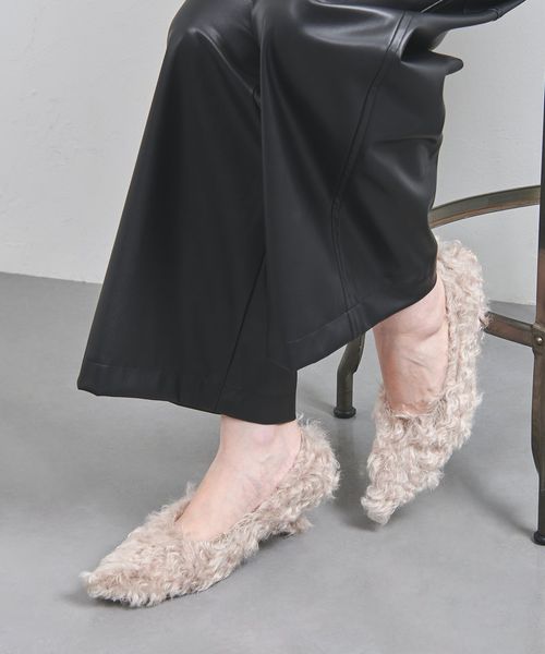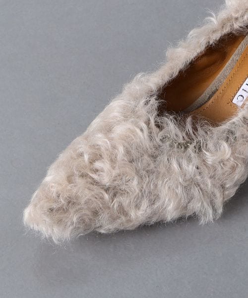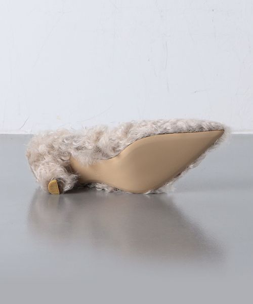 くるくるとカールしたフェイクファーがキュートなポインテッドトゥパンプス