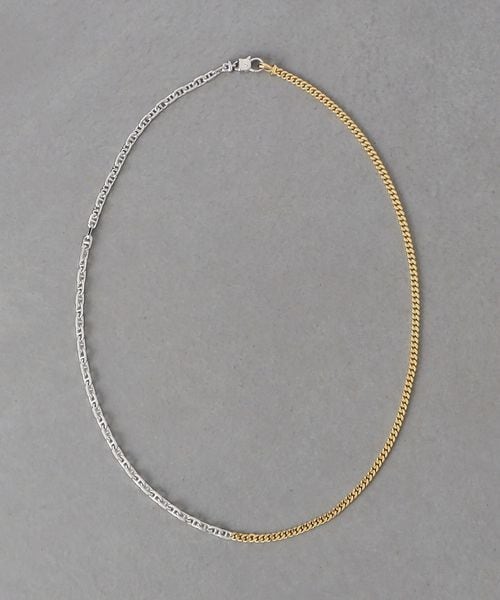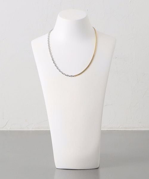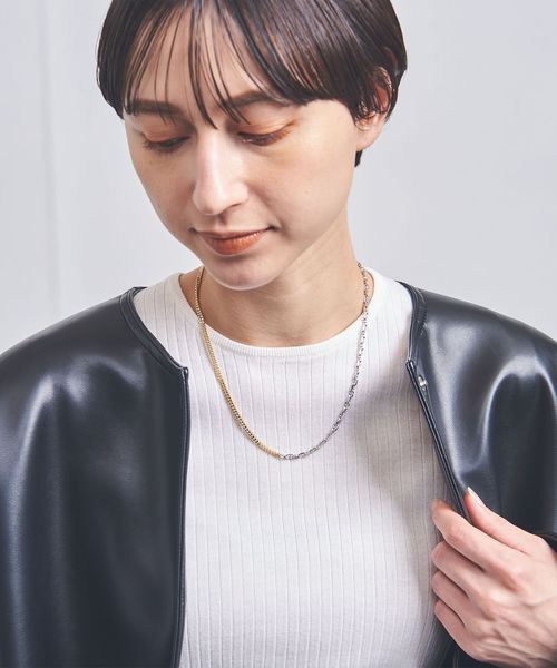 カラーと形の異なるチェーンをあしらった目を引くネックレス
