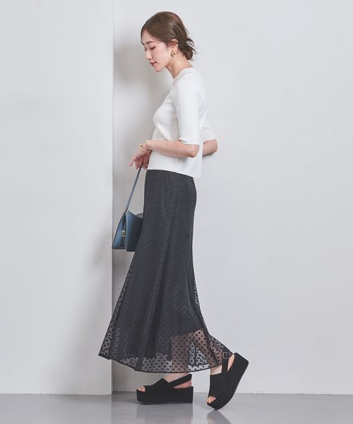ボリュームのあるデザインには透け感のある軽やかなスカートを合わせてバランスをとるのがおすすめ。