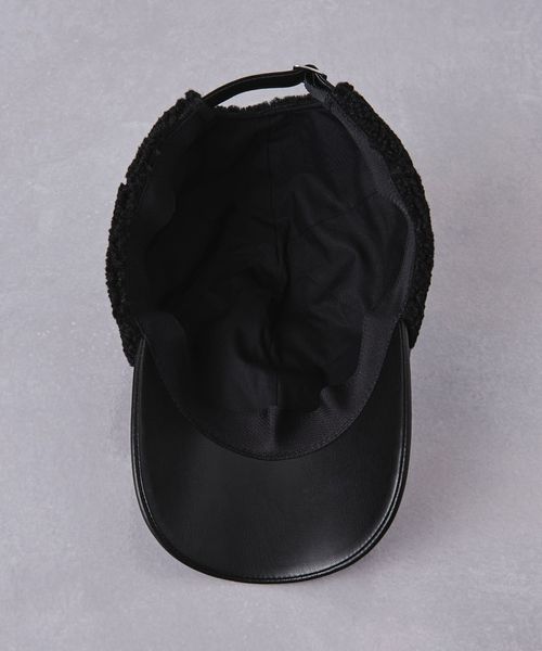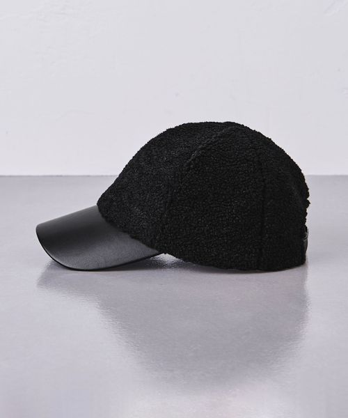 クラウンは細かいボア素材、ツバはレザー調素材のコンビ使いのキャップ。