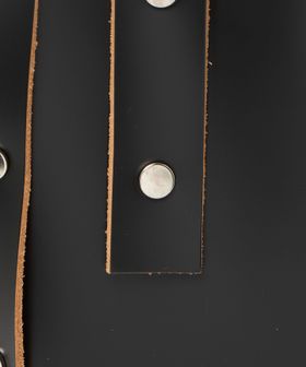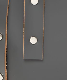 本体部分は縫製ではなく、あえてリベットでつなぎ合わせた作りで、自然なカーブを描くラインとフラットな表面感が混在した特徴的なデザイン。