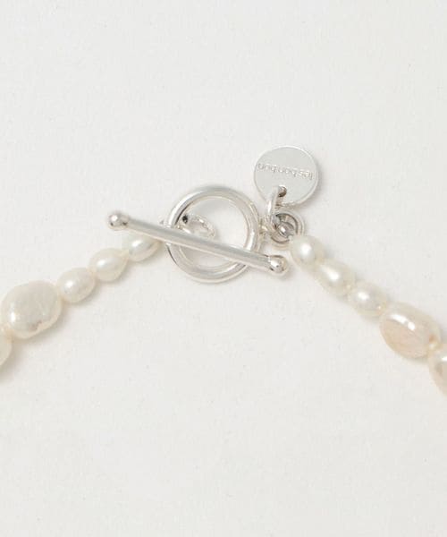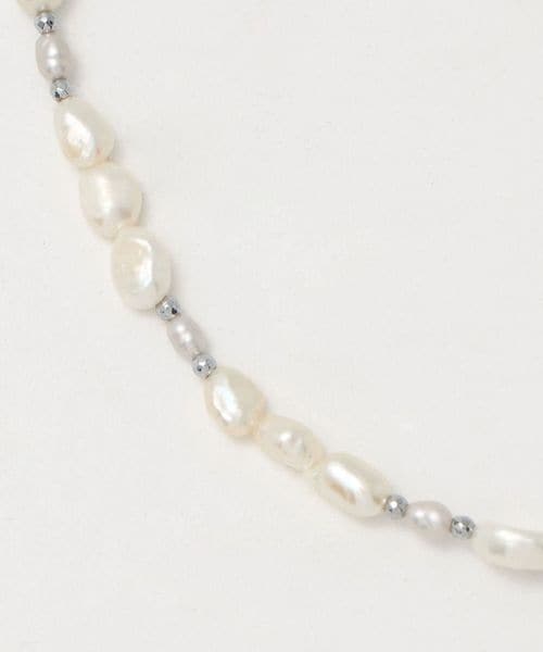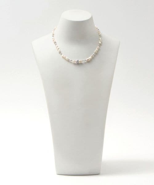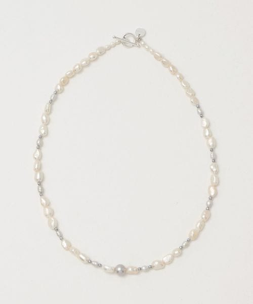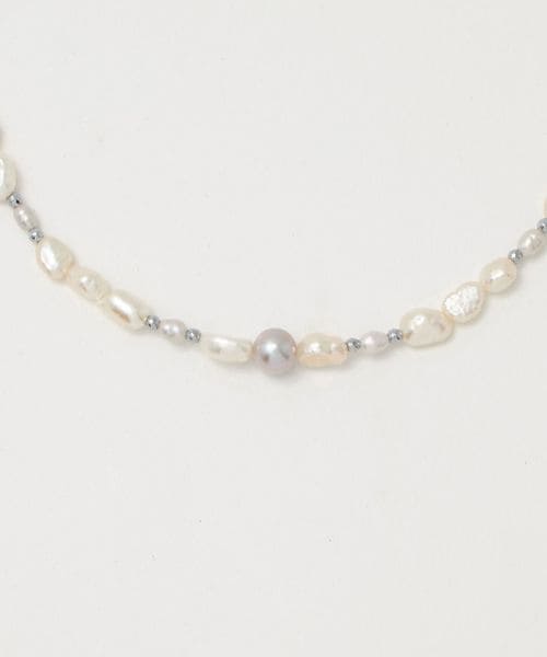 2色の淡水パールにシルバーカラーのパーツを組み合わせた、モード感をプラスするネックレス。