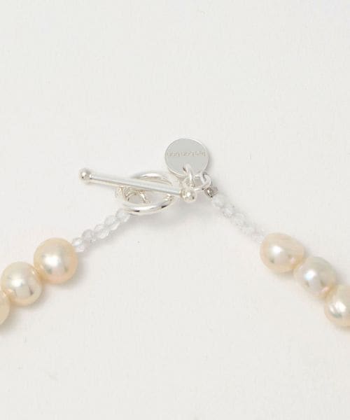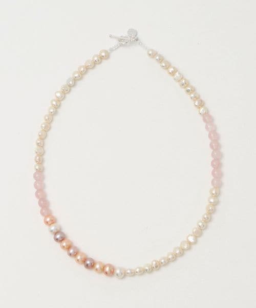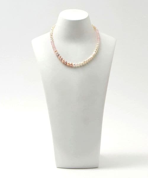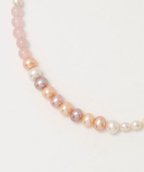 淡水パールにローズクォーツなどを加え、柔らかな色合いで仕上げたフェミニンなネックレス。