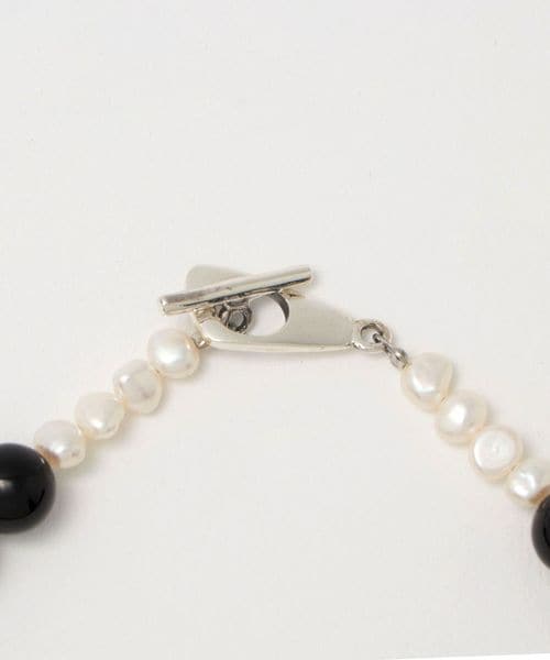 オニキスの自然なつやめきと留め具の左右に配した淡水パールが、さりげない上質感を演出します。