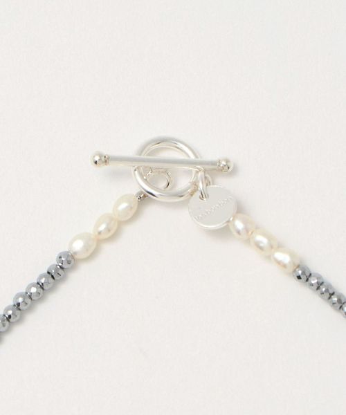 マンテルタイプの金具の両サイドに配した淡水パールがフェミニンなワンポイントです。