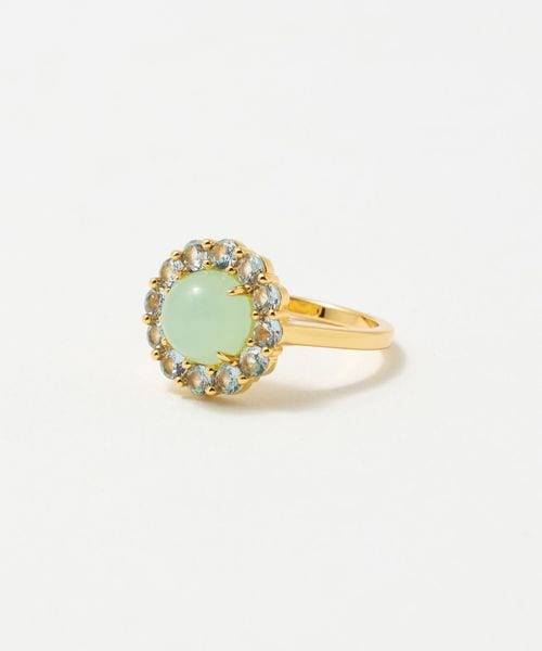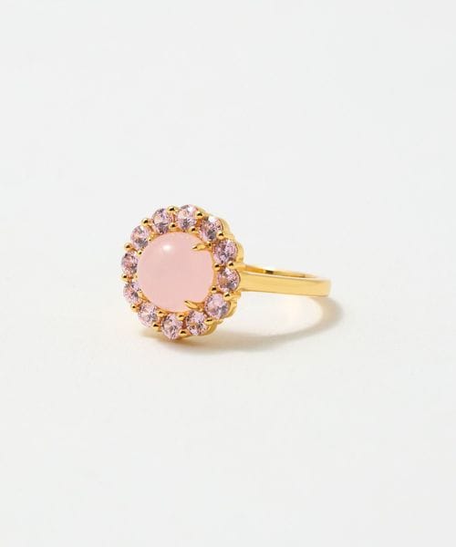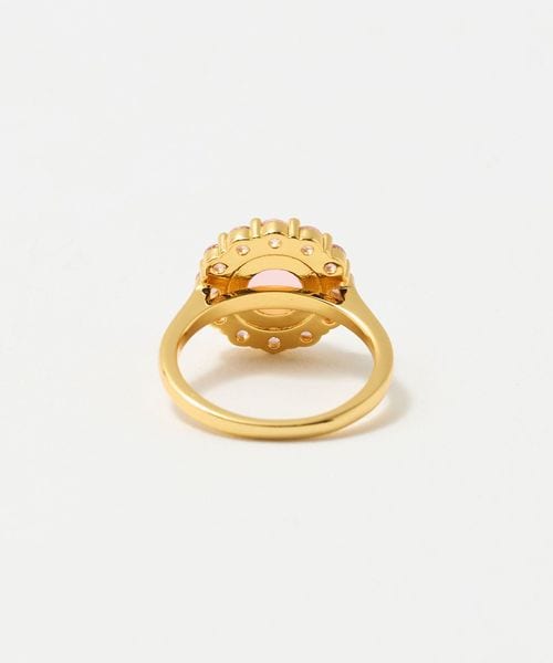 ミルキーカラーの人工石の周囲にカラービジューを飾ったリング。