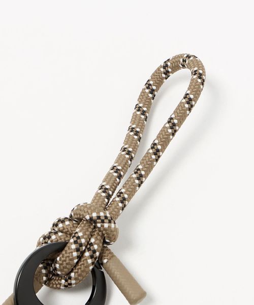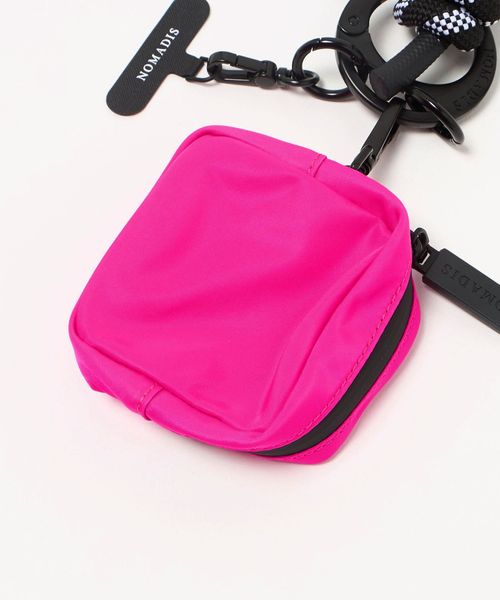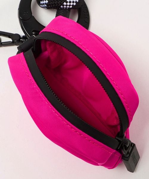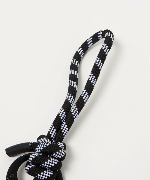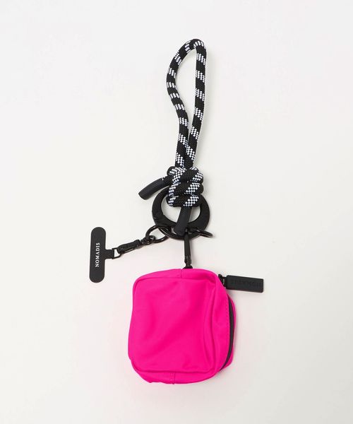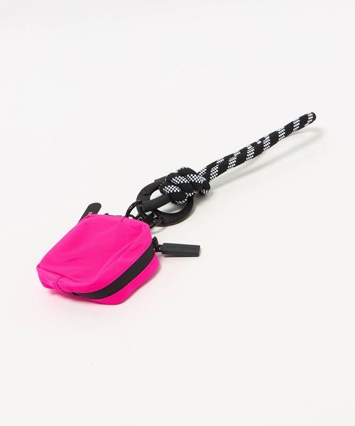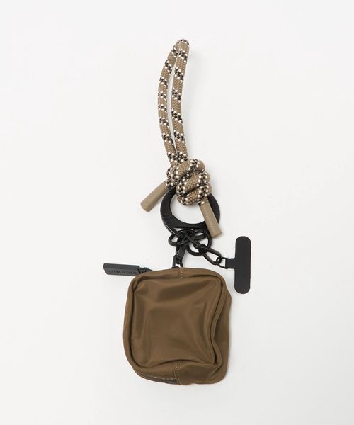 丸いフォルムが印象的なブランドオリジナルのカナビラに、スマートフォンに取り付けられるパーツ、鍵やチャームを付けられるリングとミニポーチがセットされたガジェット系ストラップ。