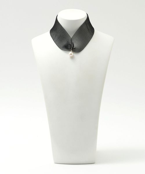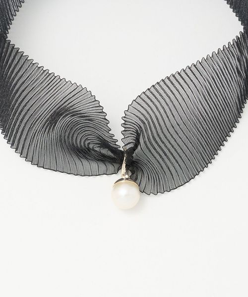 プリーツリボンに上品なパールを配したチョーカーは、留め具がなくさっと着脱できる仕様。