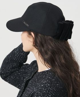 「kelly」キャップと同型の本体で、バックのゴム部分にベルベット調の太幅リボンを幾重にも重ねて、シュシュのような装飾をアタッチしたエレガントな一品。