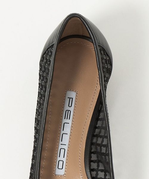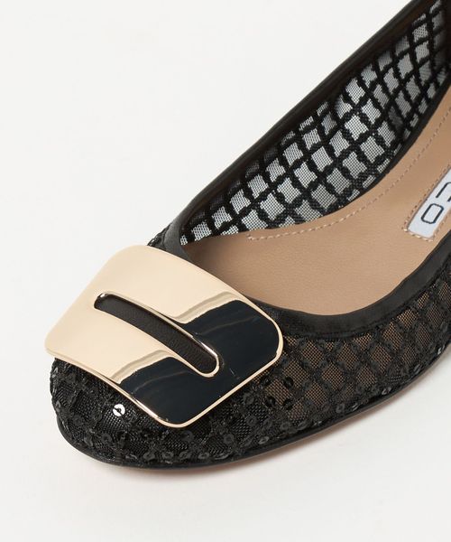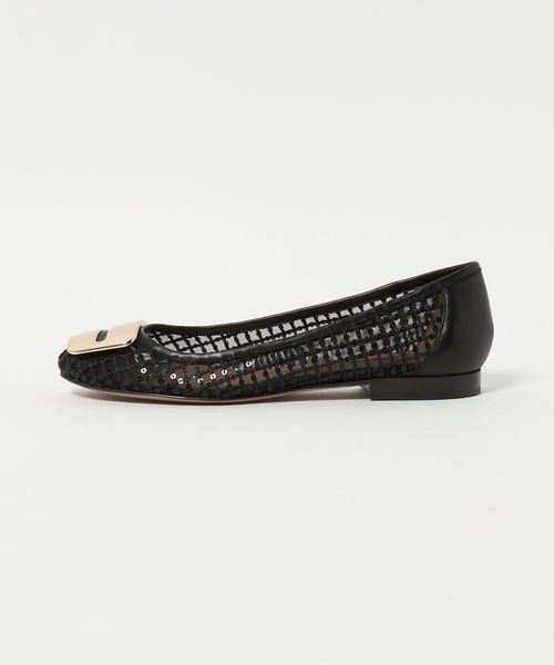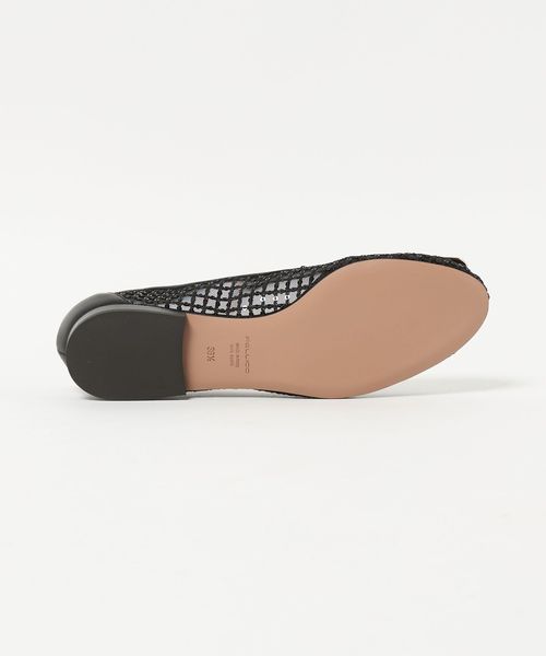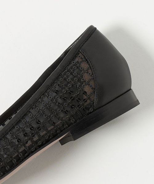 メッシュにスパンコールを格子状にあしらった、繊細で女性らしい印象を演出するフラットシューズ。。