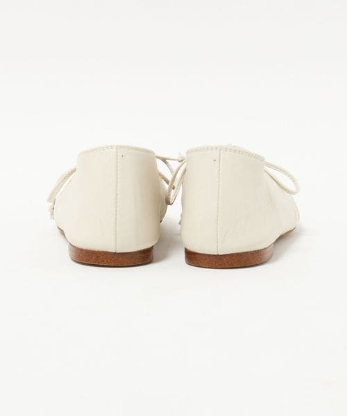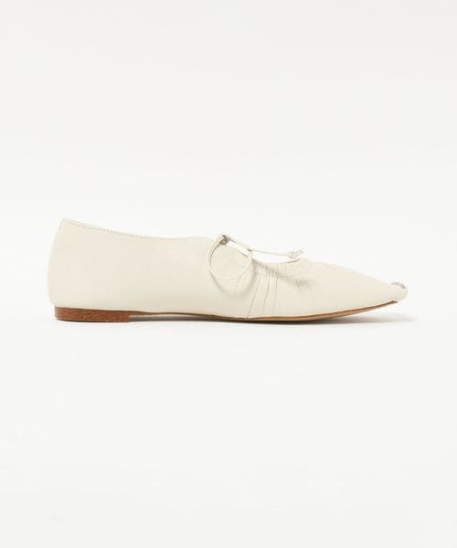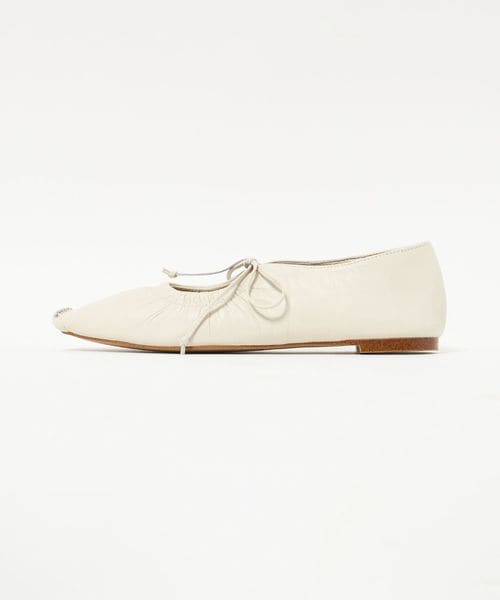 シャープなトゥにギャザーとリボンをあしらった、甘辛ミックスのフラットシューズ