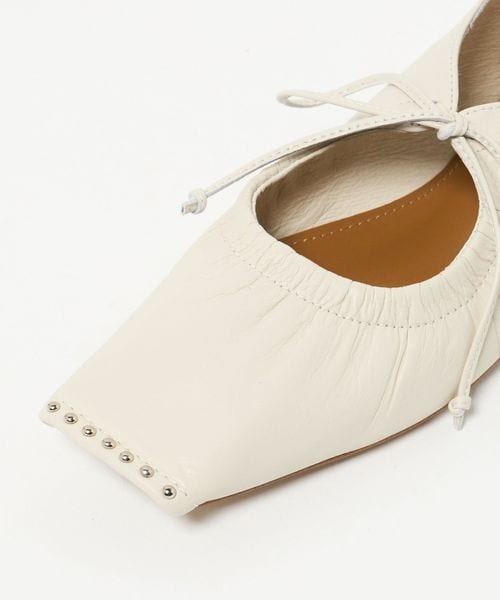 スタッズを配したトゥにギャザーやリボンのフェミニンなディテールを取り入れた一品。