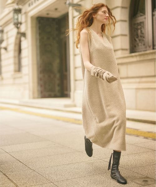 シックなニットワンピースと合わせれば、ミニマルで洗練されたスタイルが完成。