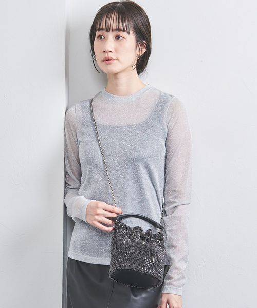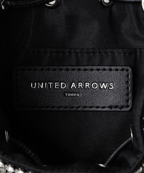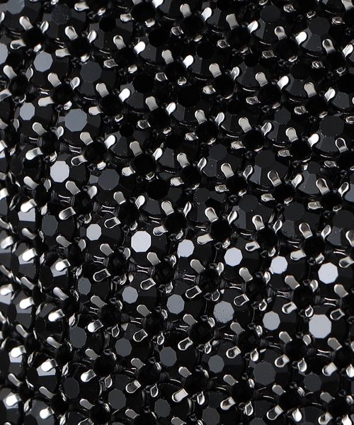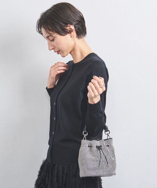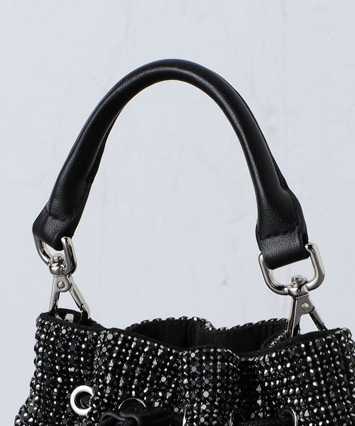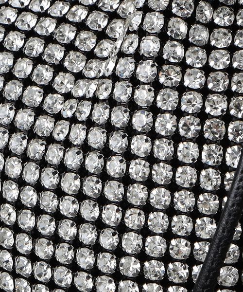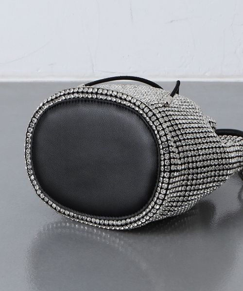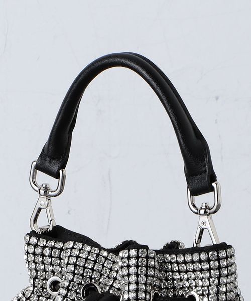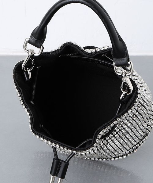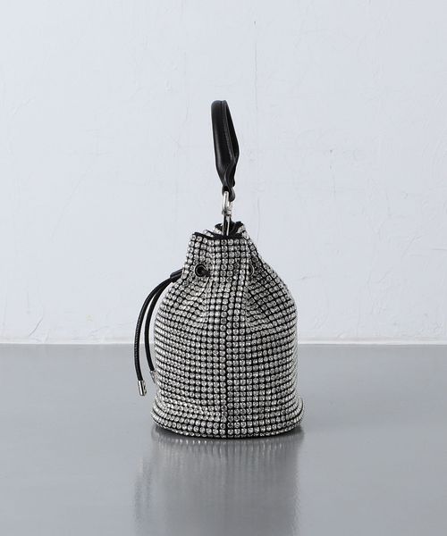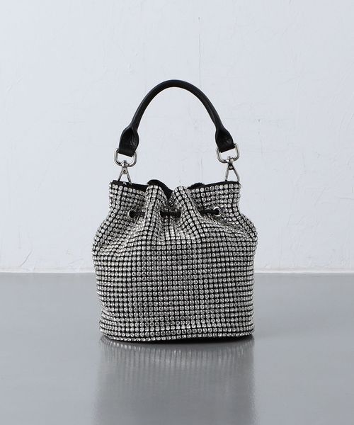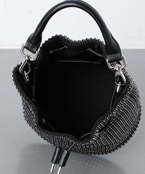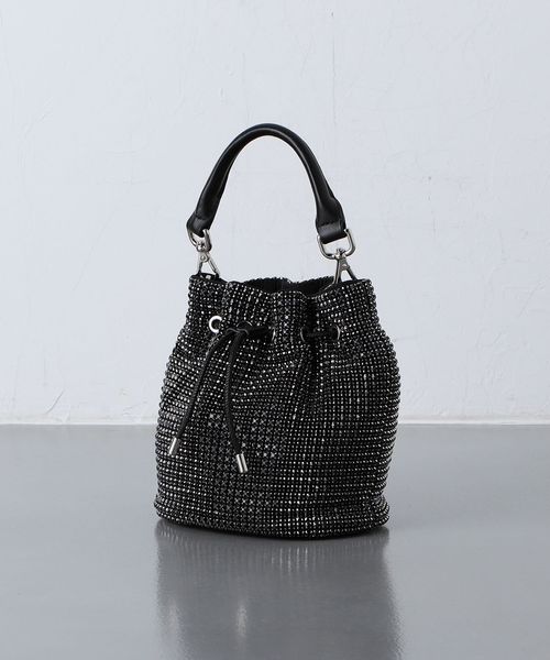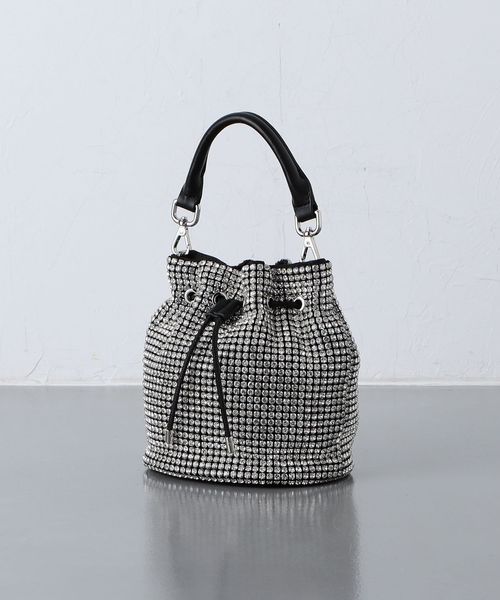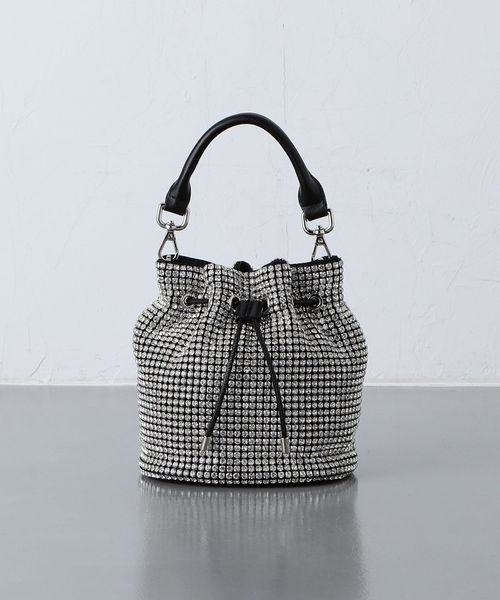 ラインストーンの煌めきがエレガントな雰囲気ながら、間口をドローストリングで開閉するこなれ感のあるデザイン。