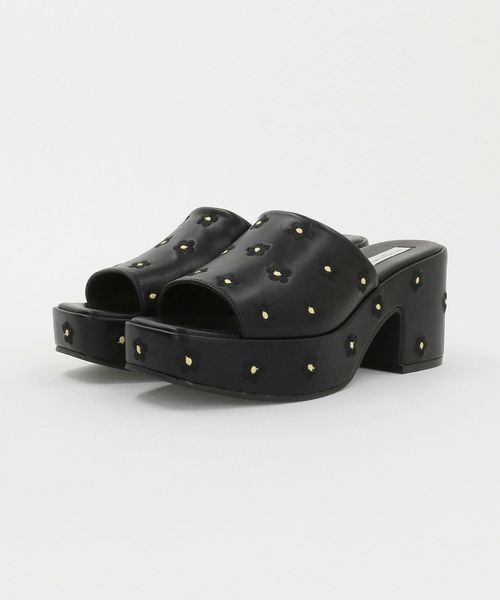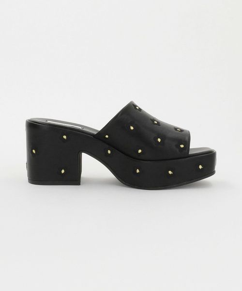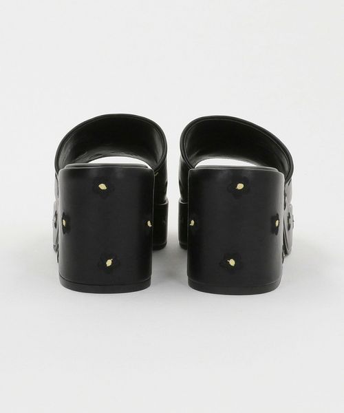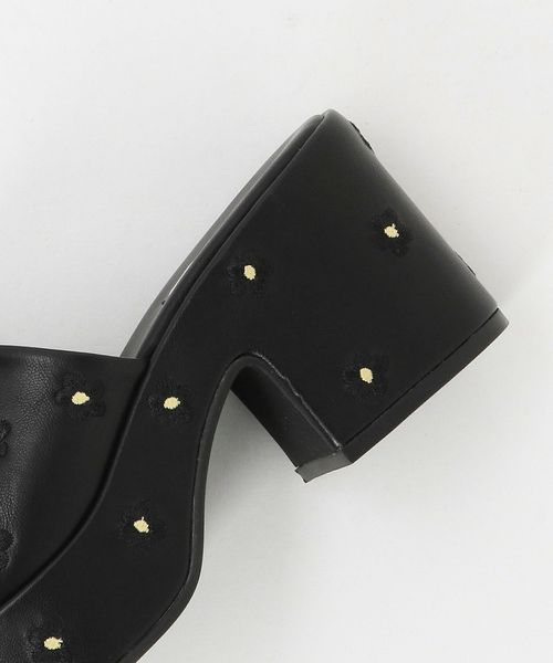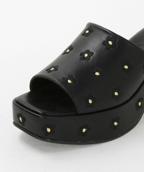 ヒールやソールにも刺繍を散りばめながらも、可愛らしくなりずぎないムードを演出するプラットフォームタイプ。