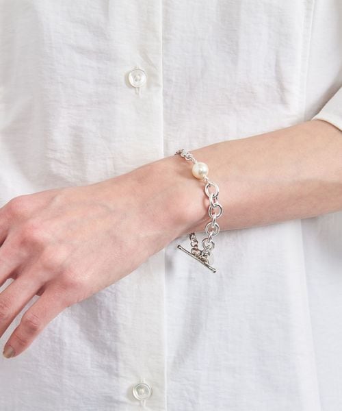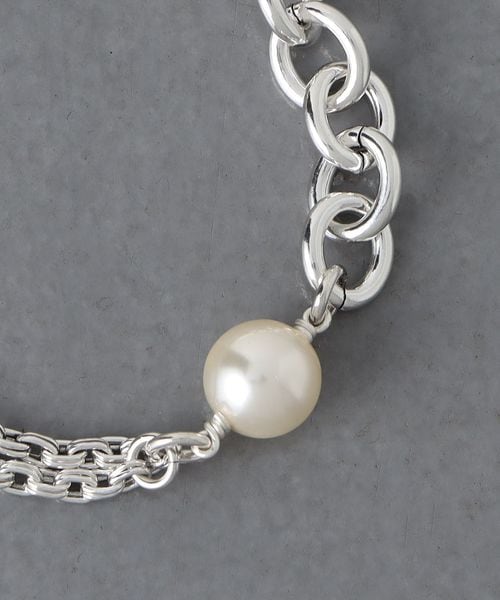 繊細なチェーンとイミテーションパールがさりげないフェミニンな雰囲気を演出します。