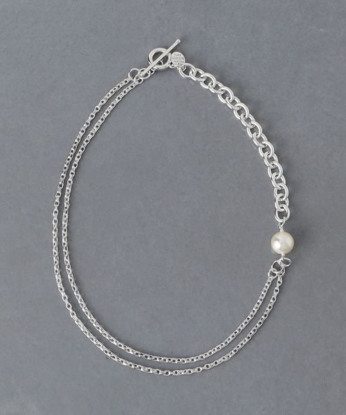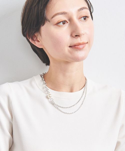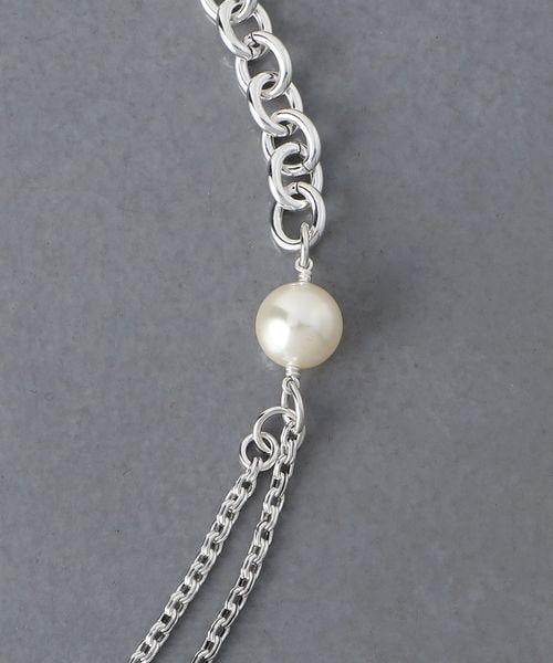 繊細なチェーンとイミテーションパールがさりげないフェミニンな雰囲気を演出します。