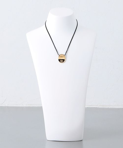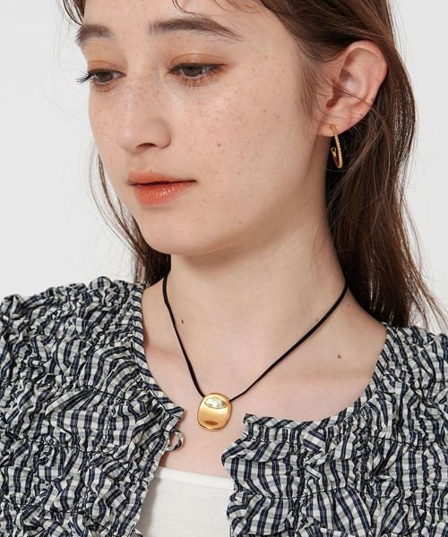 ゴールドカラーのトップとマンテルが、カジュアルな印象を抑えて上品につけられるコードネックレス。