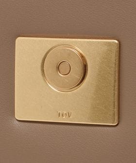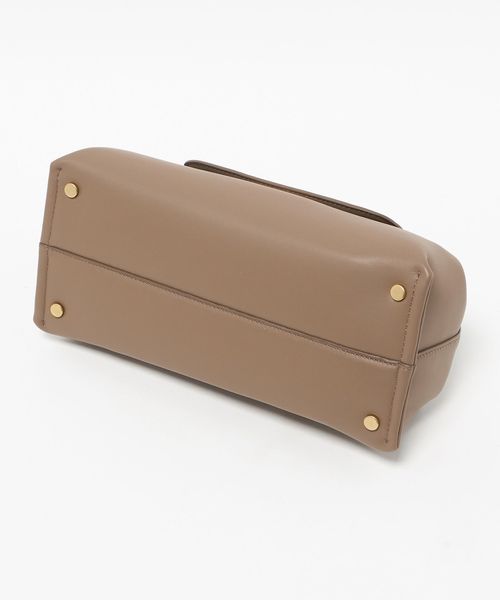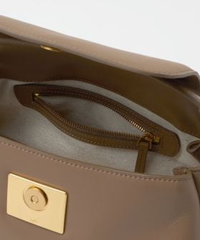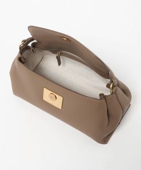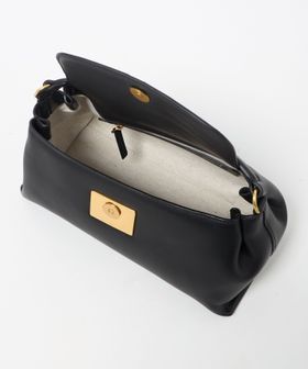 ふっくらとしたバッグ本体と、シャープなスクエア型のオリジナル留め具とのコントラストがデザイン全体を引き締めています。