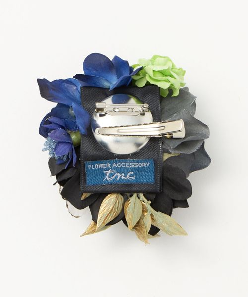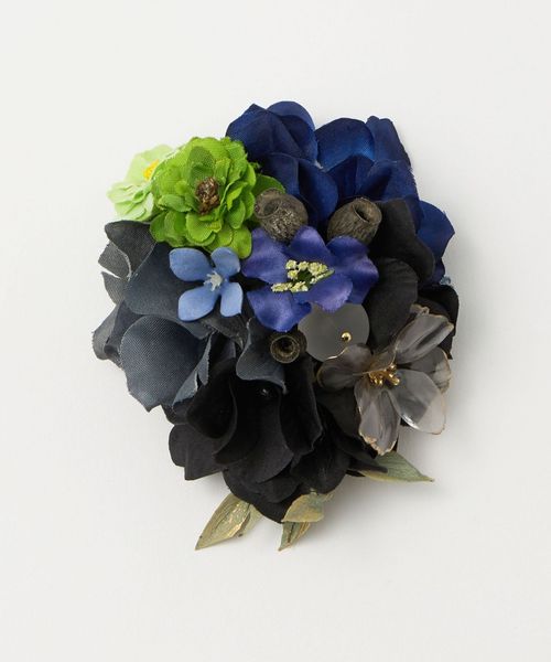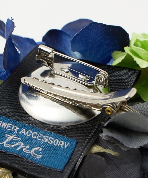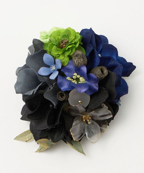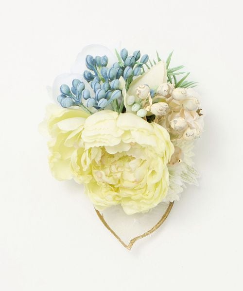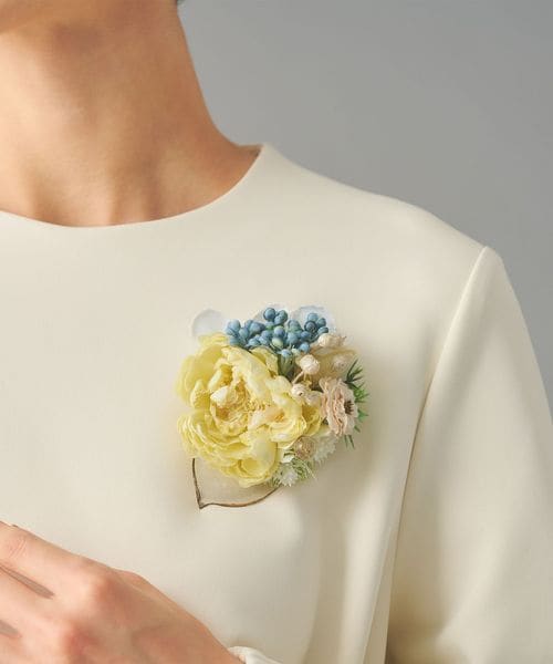 さまざまな花材のミックスでブーケのような雰囲気に仕上げたコサージュ。