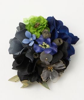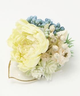 さまざまな花材のミックスでブーケのような雰囲気に仕上げたコサージュ。