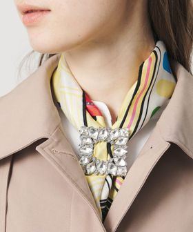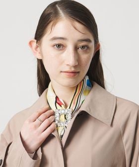 ひし形や四方にスクエア型の大きめなビジューをあしらったブローチ。