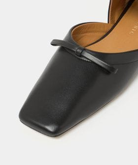 深めのアッパーにあしらったリボンがさりげないアクセントのフラットシューズ