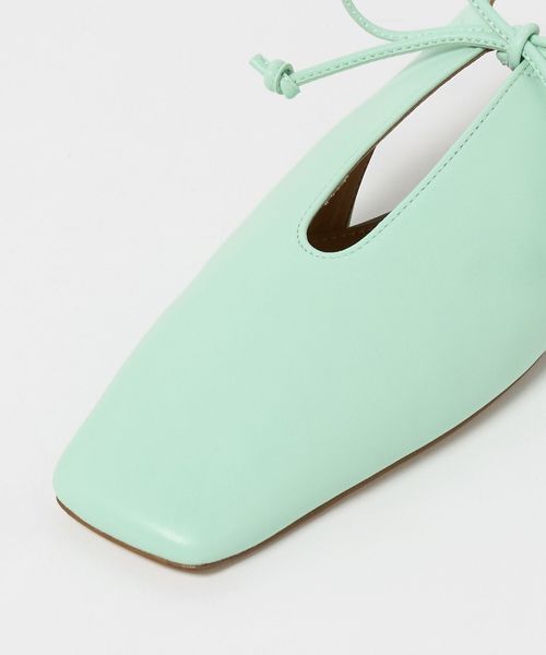 肌が覗くサイドオープンデザインの女性らしさと、スクエアトゥのマスキュリンなムードを併せ持った一品。