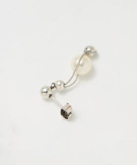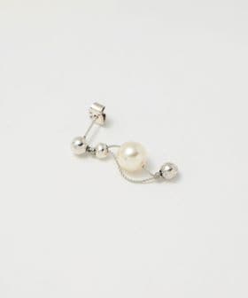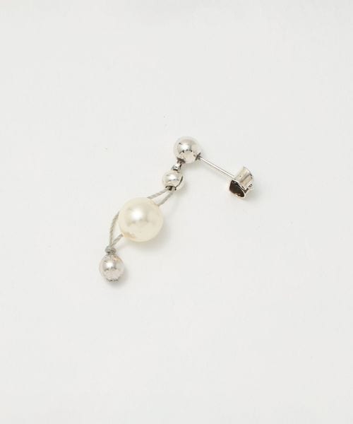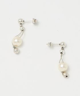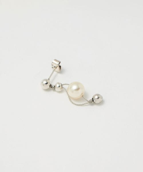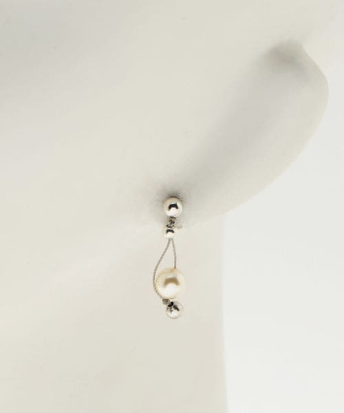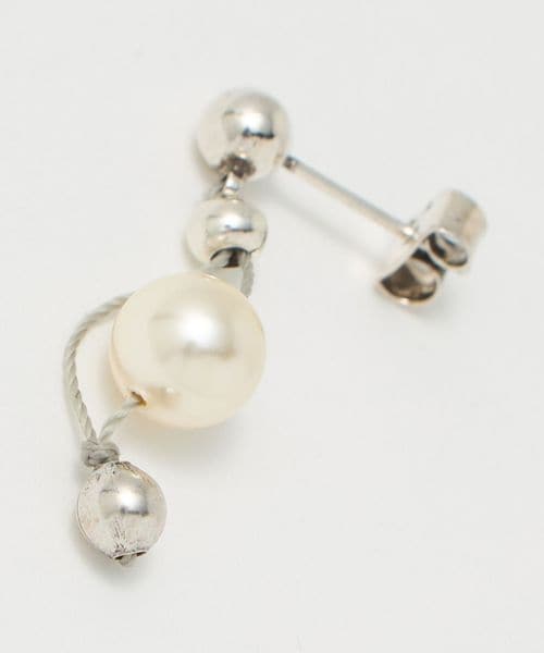 シルバーカラーのボールパーツとパール調モチーフを、細いロープで繋いだ個性的なデザイン。