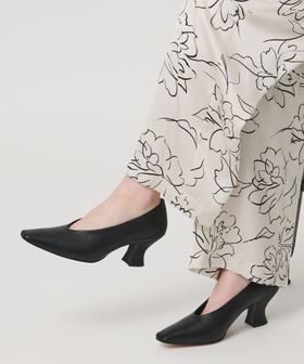 すっきりとしたシルエットに特徴のある変形ヒールでモードな雰囲気のパンプス。