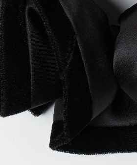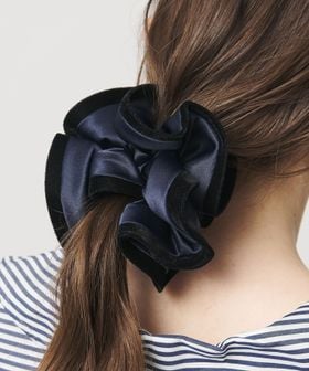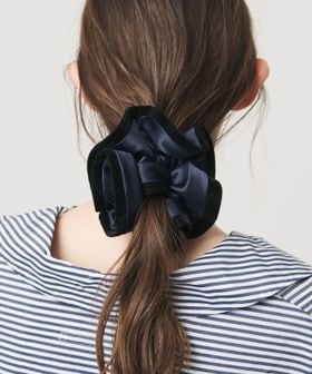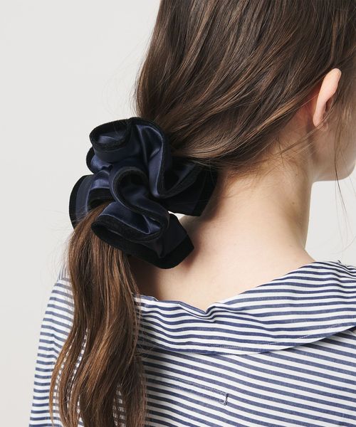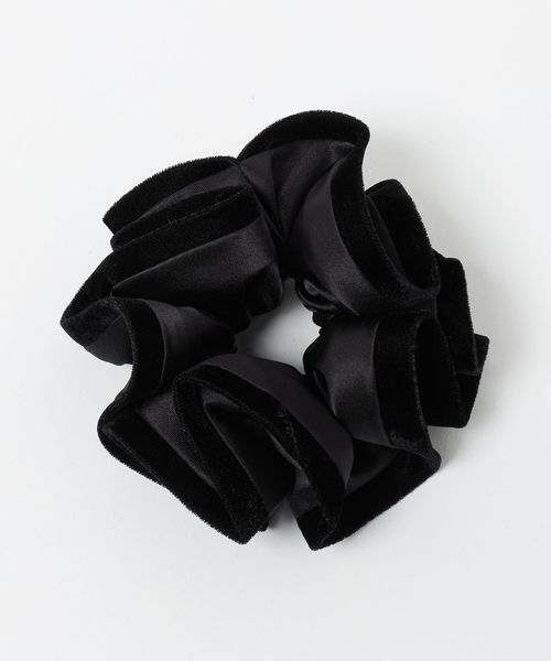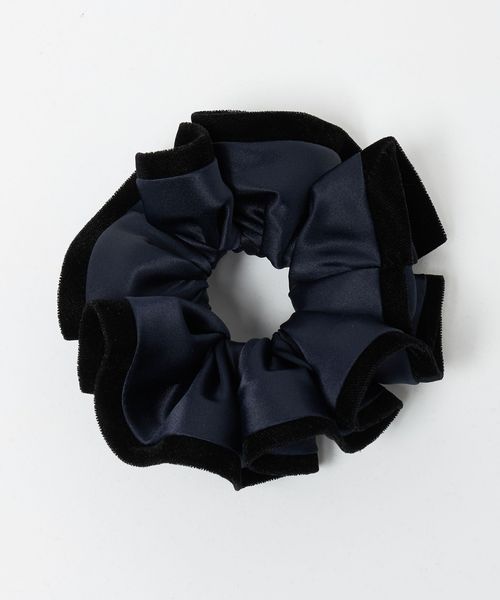 サテン生地に起毛素材をトリミングしたシュシュ。