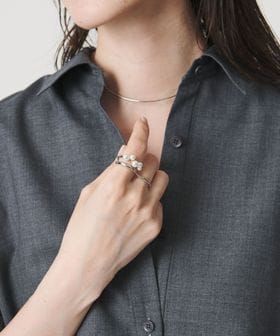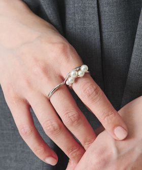 イミテーションパールをあしらった、モダンなシルエットのダブルフィンガーリング
