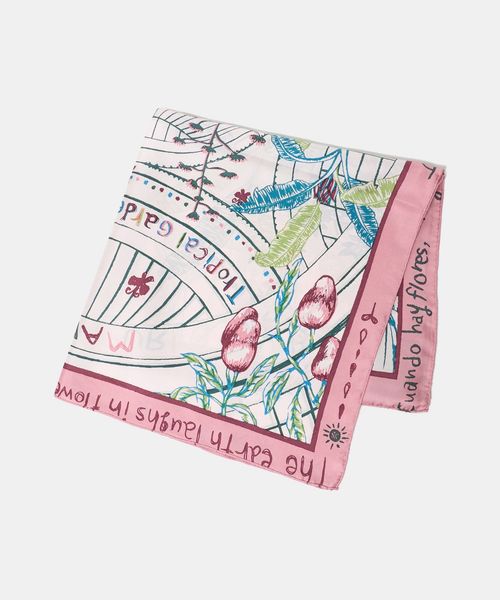 さまざまな物や出来事から着想を得た絵柄を、繊細なタッチで描いたスカーフ。