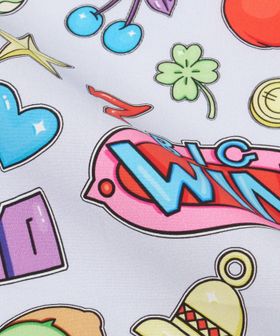 色鮮やかでポップなモチーフが、日常のスタイリングにさりげない個性を加えてくれる一品。