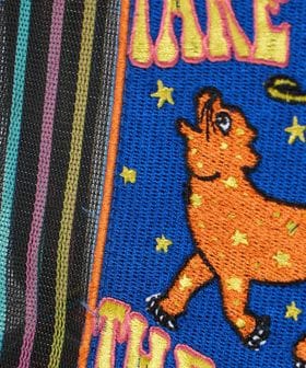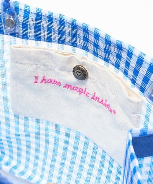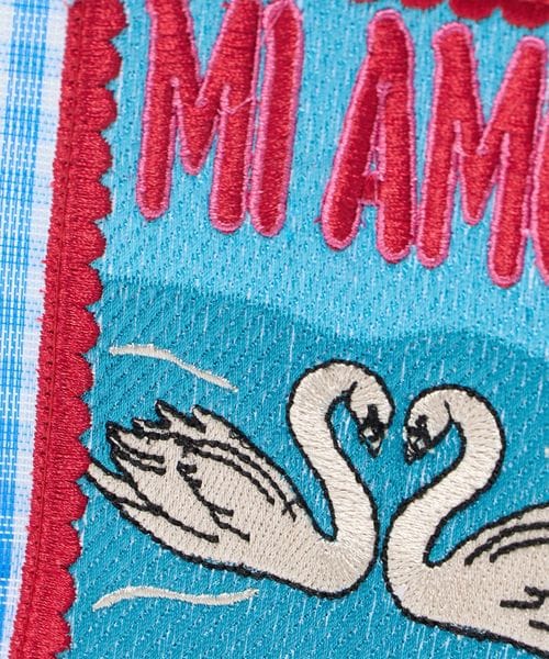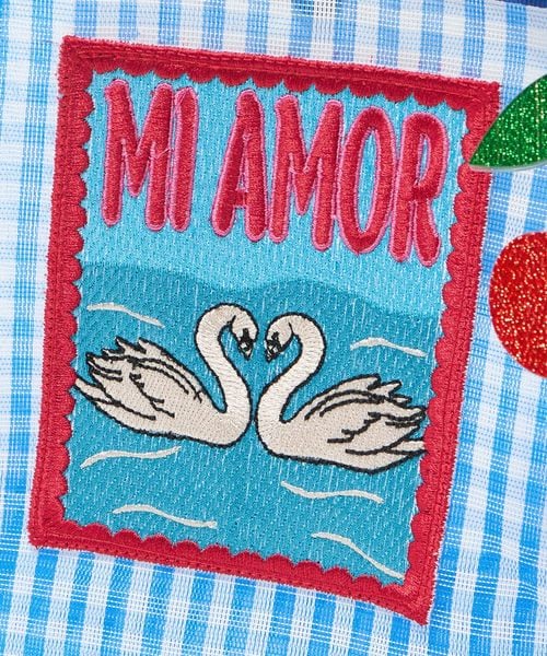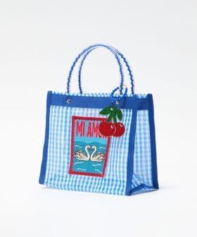 ブルーのギンガムチェック柄には優雅に泳ぐ白鳥のワッペンとチェリーのチャームを、カラフルなストライプ柄には夜空に向かって吠えるジャガーのワッペンと星型のチャームをあしらい別注しました。