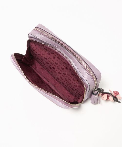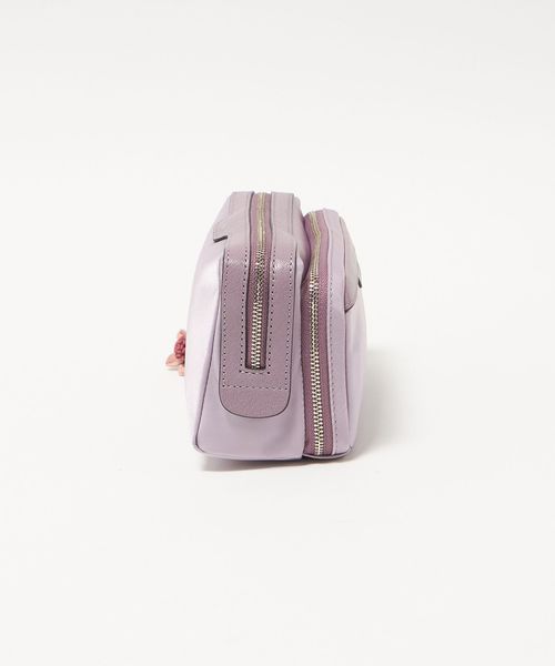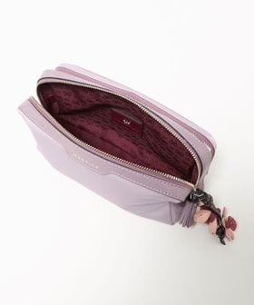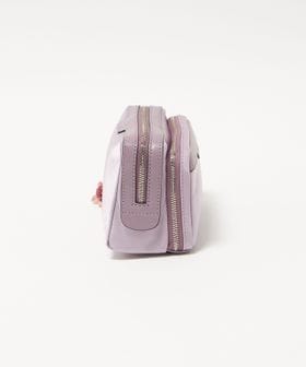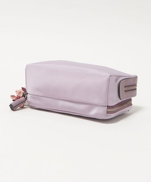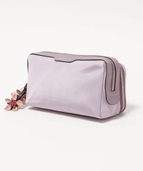 ナイロンのボディにレザーのトリミングを施し、桜の花のチャームをあしらった「Sakura」コレクションのポーチ。