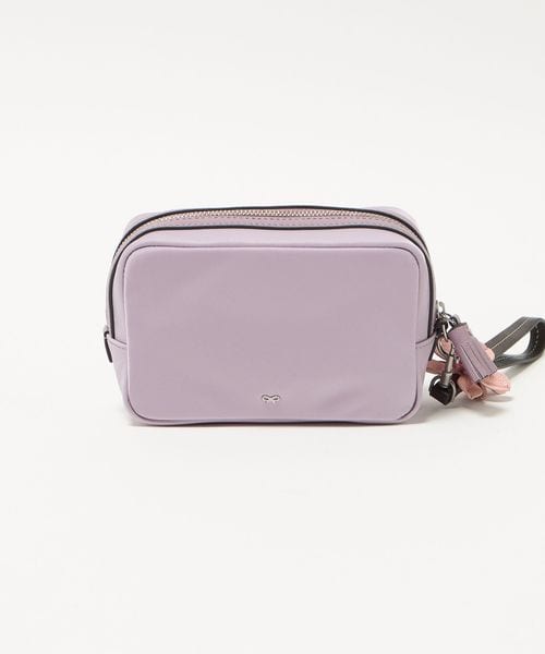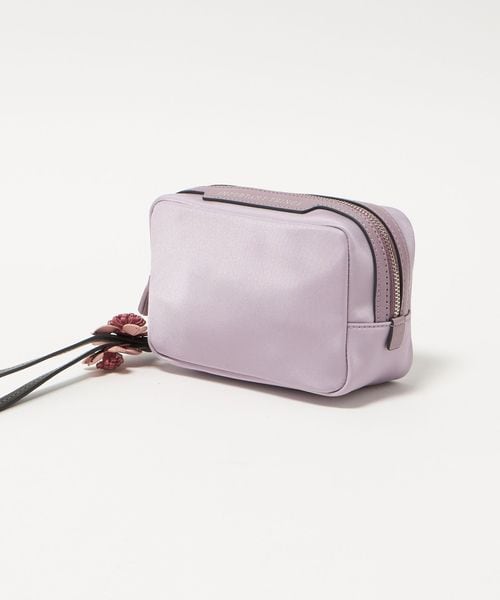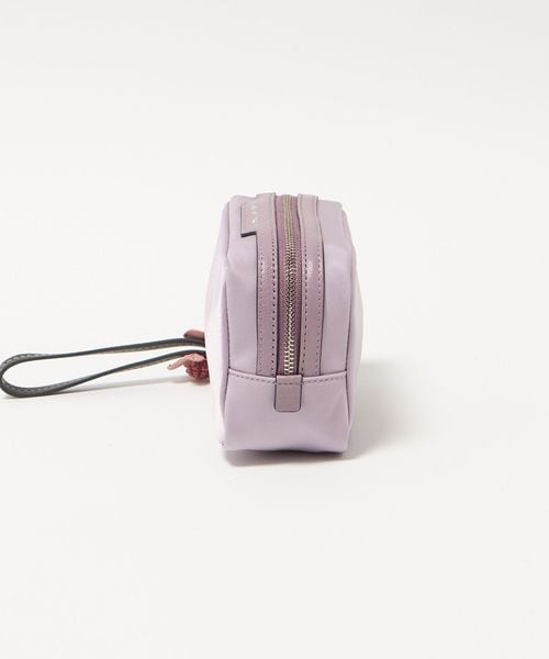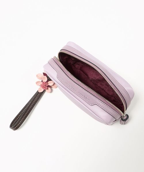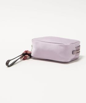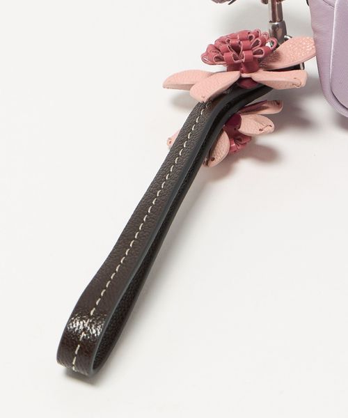 ナイロンのボディにレザーのトリミングを施し、桜の花のストラップをあしらった「Sakura」コレクションのポーチ。