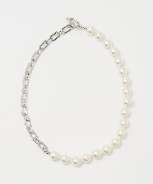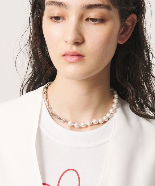 大ぶりなイミテーションパールとチェーンを組み合わせてこなれた雰囲気に仕上げたネックレス