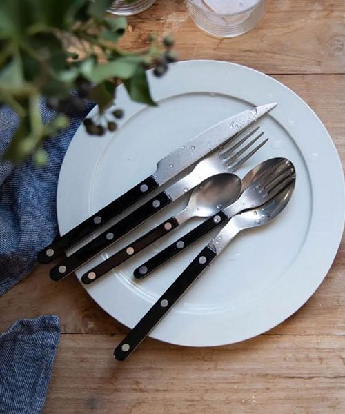 ステンレス製のカトラリーの柄の部分を板でサンドし3つの丸い金属のリベットでボタンのように留められています。