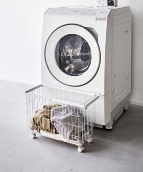 洗濯機の幅に合うワイドなキャスター付きランドリーバスケット。