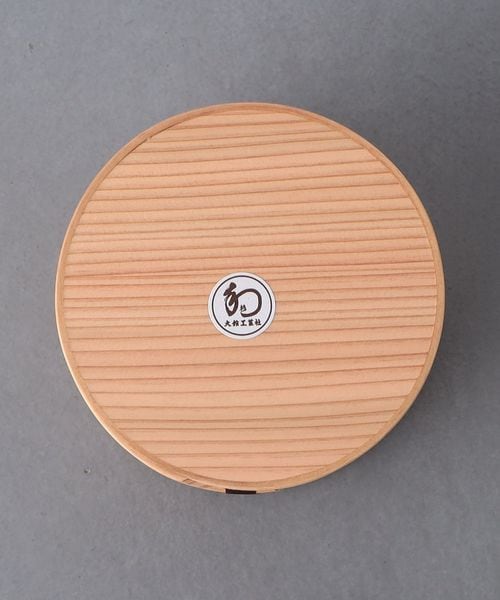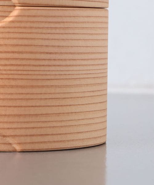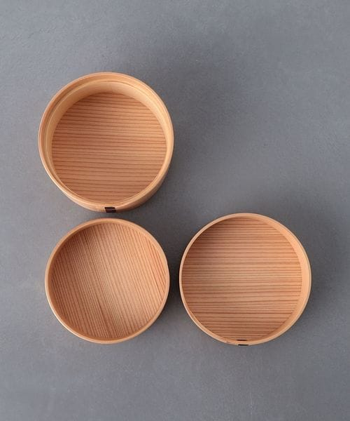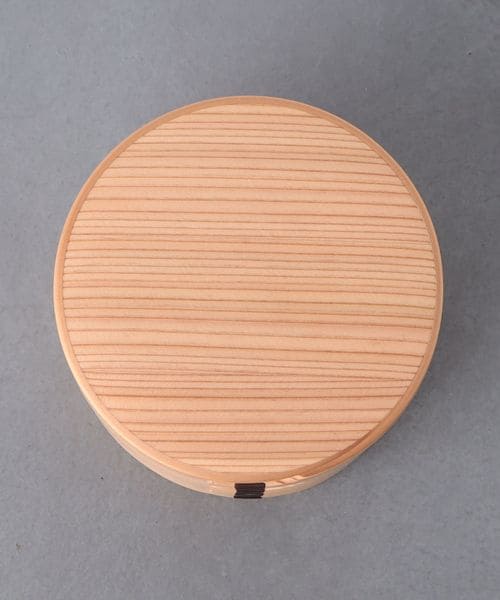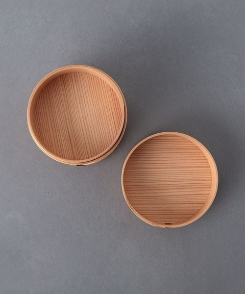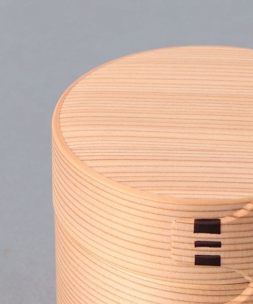 まるい形で2段になった曲げわっぱのお弁当箱。